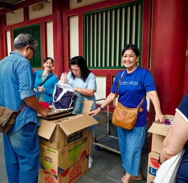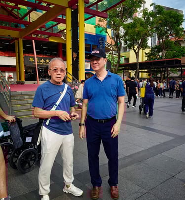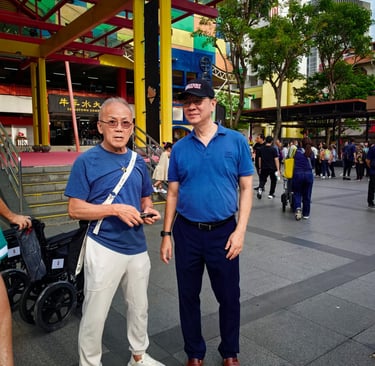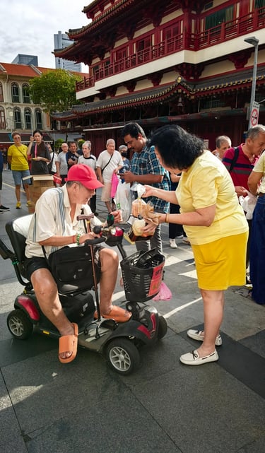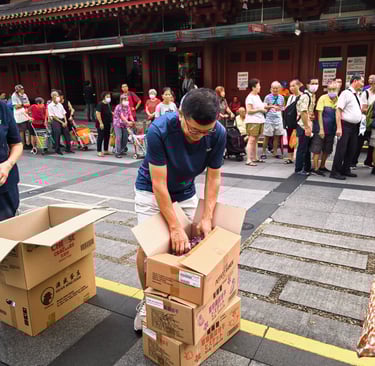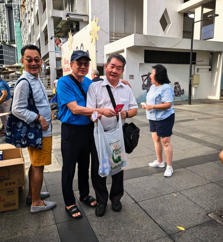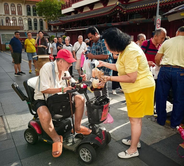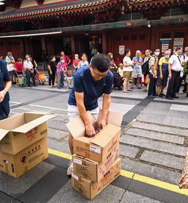 A close-knit group delivering food and essentials to seniors in Chinatown, Singapore.